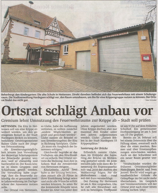 Bericht der Northeimer Neuesten Nachrichten über die Sitzung des Ortsrates Hettensen vom 14. November 2019.